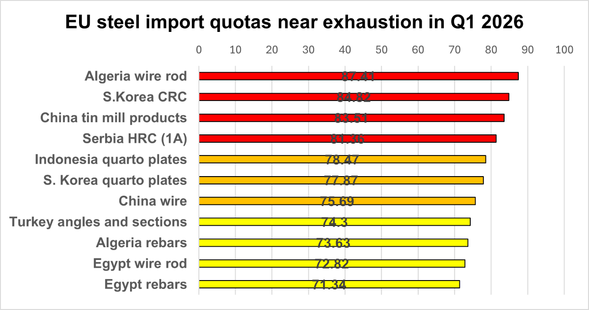 По мере приближения первого квартала периода квотирования ЕС с 1 января по 31 марта некоторые квоты на импорт некоторых видов стальной продукции, выделенные для Южной Кореи, Китая, Турции и Македонии, уже исчерпаны, в то время как более 70 процентов квот на некоторые виды стальной продукции были израсходованы, согласно данным Европейской комиссии.