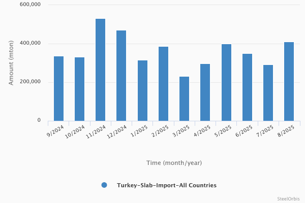 В августе этого года импорт слябов в Турцию составил 411 473 метрическ...