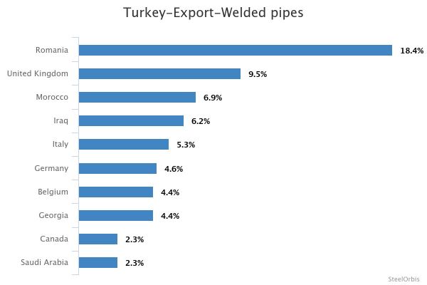 В этом году крупнейшим экспортным направлением сварных труб из Турции была Румыния, которая получила 385 175 тонн, что на 2,1% меньше в годовом исчислении. A сопровождалась Великобританией с 199 126 т, что на 5,9% больше, и Марокко с 144 929 т, что на 355,6% больше, чем в прошлом году.