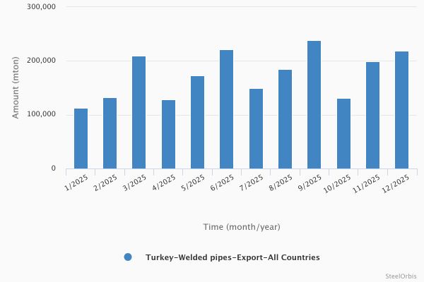 В 2025 году экспорт сварных труб из Турции составил 2,09 млн тонн, что на 0,5% больше, в то время как стоимость этого экспорта снизилась на 4,5% до $ 1,82 млрд, как в годовом исчислении.