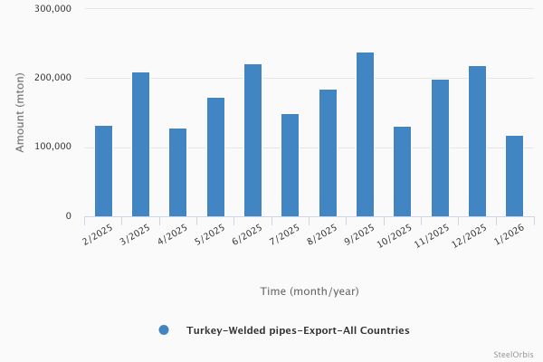 В январе этого года экспорт сварных труб из Турции составил 118 536 метрических тонн, снизившись на 44,3 процента в месячном исчислении и увеличившись на 4,7 процента в годовом исчислении, согласно предварительным данным, предоставленным Турецким статистическим институтом (TUIK). Между тем, выручка от этого экспорта составила 117,93 миллиона долларов США, снизившись на 37,5 процента по сравнению с предыдущим месяцем и увеличившись на 11,1 процента по сравнению с январем 2025 года.