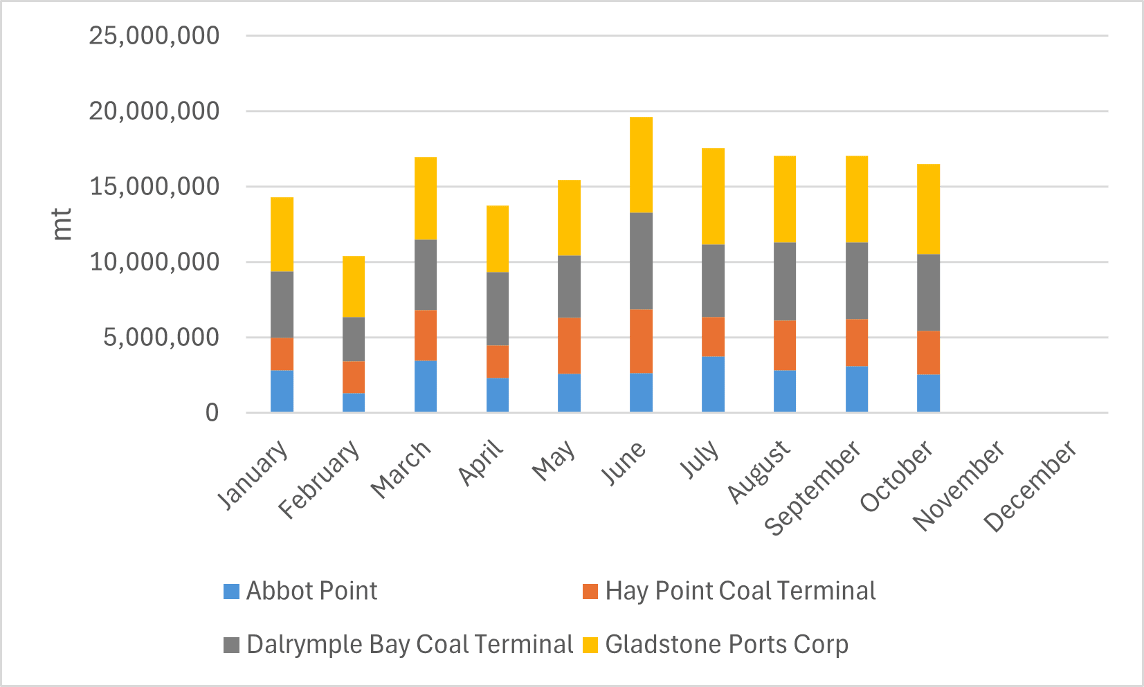 В октябре этого года экспорт угля из австралийских портов Хей — Пойнт, угольного терминала Далримпл — Бэй (DBCT), Эббот — Пойнт и Гладстон, расположенных в штате Квинсленд, снизился на один процент в годовом исчислении и снизился на 3,1 процента в месячном исчислении до 16,52 млн тонн, согласно данным, опубликованным North Queensland Bulk Ports Corporation и Gladstone Ports Corporation.