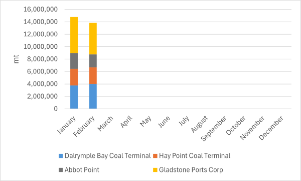 В феврале этого года экспорт угля из австралийских портов Хей-Пойнт, угольного терминала Далримпл-Бэй (DBCT), Эббот-Пойнт и Гладстон, расположенных в штате Квинсленд, увеличился на 32,8 процента в годовом исчислении и снизился на 6,2 процента в месячном исчислении до 13,84 миллиона тонн, согласно данным, опубликованным North Queensland Bulk Ports Corporation и Gladstone Ports Corporation.