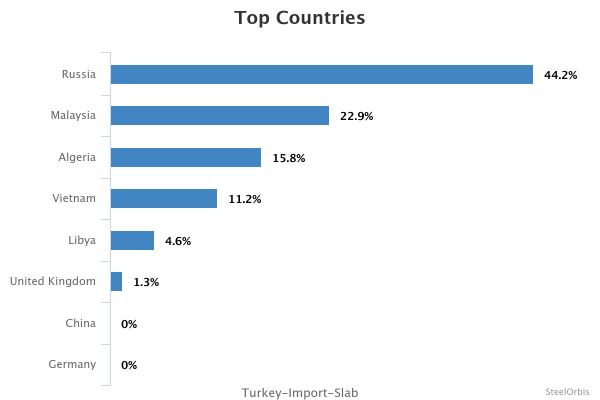 В указанный период крупнейшим источником импорта слябов в Турцию была Россия, которая поставила 193 677 т, снизившись на 41,3% в годовом исчислении. За Россией следовали Малайзия с 100 454 тоннами, что на 51,5% меньше, и Алжир с 69 067 тоннами.