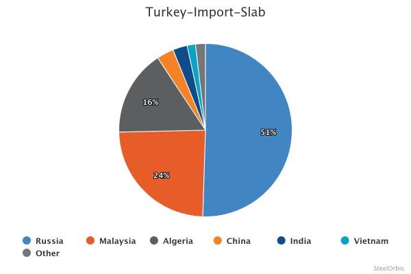В данном периоде крупнейшим источником импорта слябов в Турцию была Россия, которая поставила 1,62 млн тонн, увеличившись на 35,6% в годовом исчислении. за ней следуют Малайзия с 777 592 метрическими тоннами, что на 30 процентов меньше, и Алжир с 516 647 метрическими тоннами, что на 579,9 процента больше, чем в прошлом году.