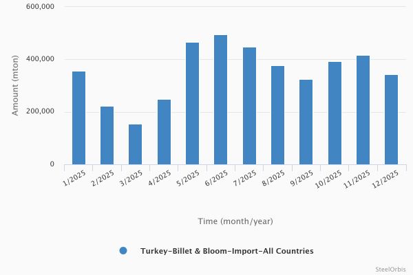 В 2025 Турция импорт заготовок и блюмов составил 4,25 миллиона тонн, увеличившись на 17,9 процента, в то время как стоимость этот импорт увеличился на 6,7 процента до 2,11 миллиарда долларов США в годовом исчислении.