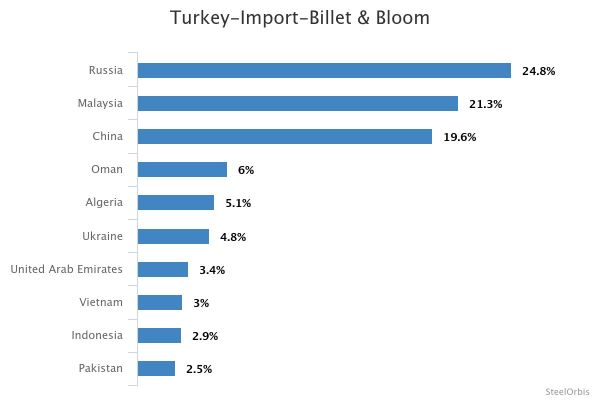 В указанный период Крупнейшим источником импорта заготовок и блюмов в Турцию была Россия, которая поставлено 1,05 млн тонн, что на 50,3 процента больше, чем в прошлом году. Россия за ней следовала Малайзия с 903 711 тоннами, что на 12,7 процента, и Китай с 832 864 тоннами, что на 52,3 процента больше по сравнению с аналогичным периодом прошлого года.
