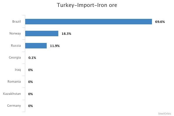 В данном месяце Турция импортировала 645 508 тонн железной руды из Бразилии, опередив Норвегию, которая поставила 169 928 тонн в данном месяце, и Россию, которая поставила 110 407 тонн железной руды.