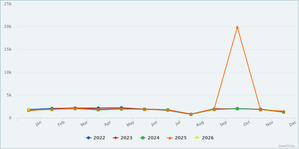 В деталях данные по горячекатаному прокату указывают на смешанную тенденцию. В январе объем производства сортового проката укрепился, увеличившись на 13,2 процента в годовом исчислении до 978 000 метрических тонн после того, как в 2025 году он закрылся на уровне 12,3 миллиона метрических тонн, что на 5,5 процента больше, чем в 2024 году. Напротив, в производстве плоского проката, несмотря на то, что 2025 год завершился на пути восстановления (рост на 4,0 процента до 9,0 миллиона метрических тонн), в первый месяц года зафиксировано снижение на 1,8 процента в годовом исчислении. В год, на общую сумму 774 000 метрических тонн
