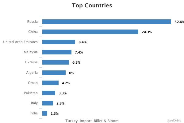 В указанный период крупнейшим источником импорта заготовок и блюмов в Турцию была Россия, которая поставила 236 013 тонн, что на 102,8 процента больше, чем в прошлом году. За Россией следует Китай с 175 680 тоннами (рост на 71,6 процента) и ОАЭ с 60 594 тоннами.
